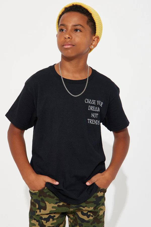 A comfortable black short-sleeve tee for boys, designed with motivational style and a relaxed fit, perfect for everyday play and casual outings.