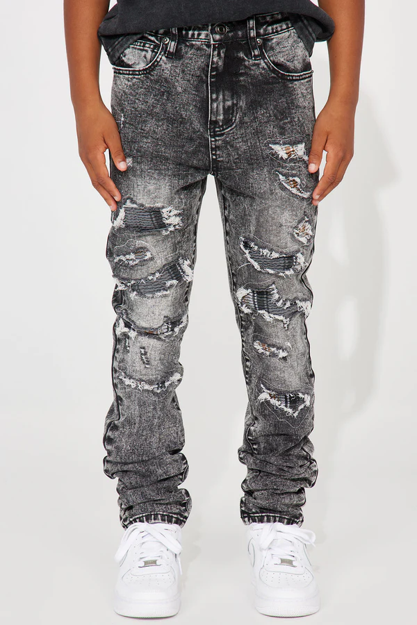 A stylish black wash skinny jean for boys featuring subtle distressed details, designed for a comfortable, modern fit suitable for everyday wear or casual outings.